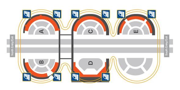 達(dá)拉斯機(jī)場一共有5個(gè)航站樓,其中Terminal D是國際航站樓。航站樓之間可以乘坐小火車(也就是下圖中的橙色線條),每個(gè)航站樓內(nèi)不還有bus可以乘坐,基本解放雙腿!