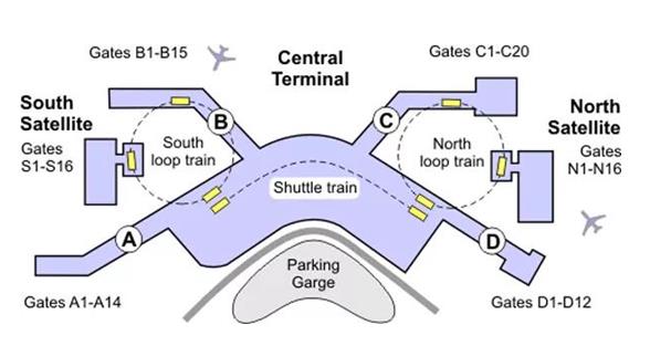 可能看了這張圖就會有人問,什么叫做South Satellite?這就要拿出我們的機(jī)場地圖了