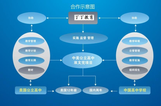 中美公立高中雙文憑項(xiàng)目采用美國(guó)公立高中與國(guó)內(nèi)學(xué)校直接校際合作,實(shí)行雙學(xué)歷文憑,采用 2+1 教學(xué)模式,其中兩年中方教學(xué),全方位引進(jìn)美方先進(jìn)的教學(xué)理念和高質(zhì)量的教學(xué)體系,由美方提供教學(xué)計(jì)劃、教學(xué)大綱、教材、教學(xué)管理模式等,授課師資根據(jù)雙方共同協(xié)商,按照開課數(shù)量由美方派遣教師,學(xué)生完成國(guó)內(nèi)兩年課程,第三年,學(xué)生可以選擇直接合作的美國(guó)公立高中,也可以選擇其他公立高中,入讀 12 年級(jí),并獲取美國(guó)高中畢業(yè)證。中方學(xué)校在項(xiàng)目合作中,負(fù)責(zé)為學(xué)生提供良好的教學(xué)環(huán)境,學(xué)生的日常管理及教學(xué)的實(shí)施;丁丁教育作為中美公立高中雙文憑項(xiàng)目的組織及服務(wù)方,負(fù)責(zé)學(xué)校前期的接洽與合作方式的確定,協(xié)助中方學(xué)校與美國(guó)公立高中溝通,配合中方學(xué)校教學(xué)的實(shí)施、監(jiān)督和管理,提供后期學(xué)生出國(guó)事宜及后續(xù)升學(xué)服務(wù)。